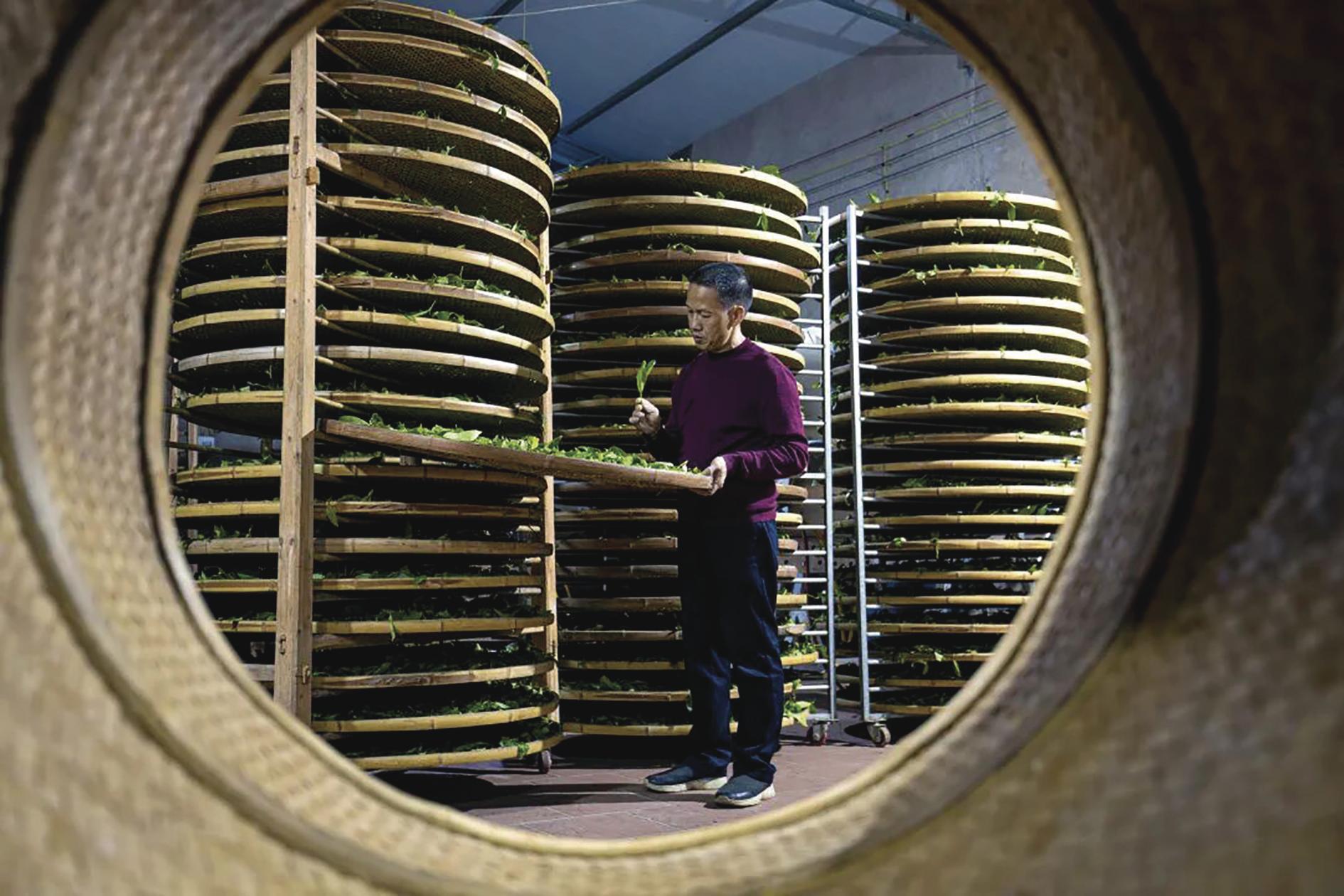 摇青车间里,老竹制成的摇青筛在木架上轻转。陈两固的手搭在筛沿,腕关节微微发力,筛子便带着茶叶跳起缓慢的圆舞。“不是摇,是‘醒’。”他突然停住,俯身抓起一把茶叶,指腹摩挲着叶缘——那抹刚泛出的淡红,是茶叶苏醒的信号。这是一场精密的博弈:摇得轻了,茶叶“睡不醒”,香气藏在叶肉里出不来;摇得重了,叶片被折腾得“疲了”,苦涩便会冒头。四十年来,这双手记住了上万次摇青的节奏,从晨光初露到暮色四合,筛子里的沙沙声,是他与茶叶达成的默契。