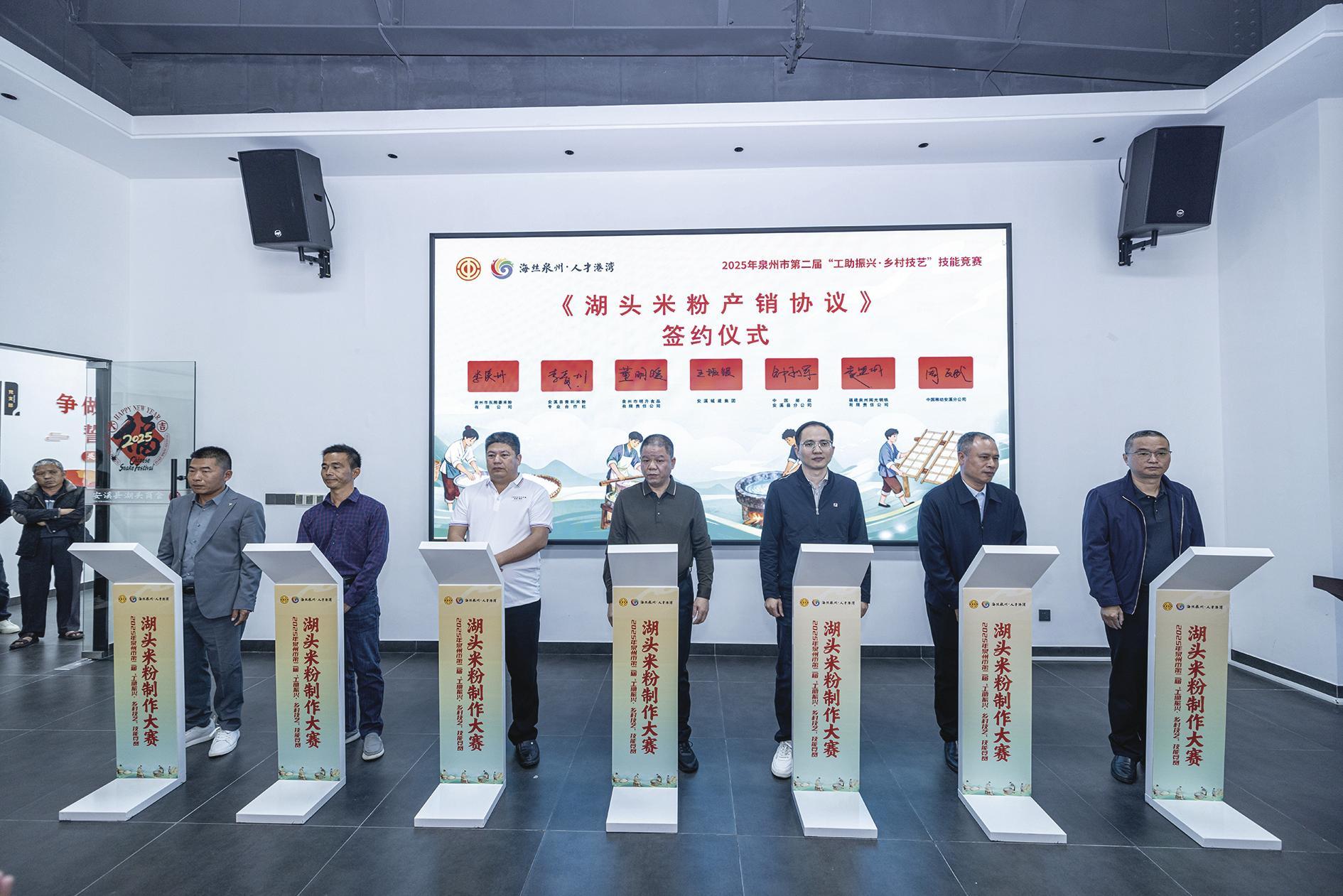 赛场内技艺比拼酣,赛场外合作签约忙。湖头米粉产业研究会与五道醋业、顺丰速运、邮政安溪分公司等企业代表握手合影,标志着米粉水循环再利用、快递优惠等合作正式落地。“有这两份合作,不仅解决了米粉生产的汤水处理难题,还减轻了米粉寄送运费,产业发展如虎添翼。”湖头镇党委组织委员陈宇鹏难掩兴奋。