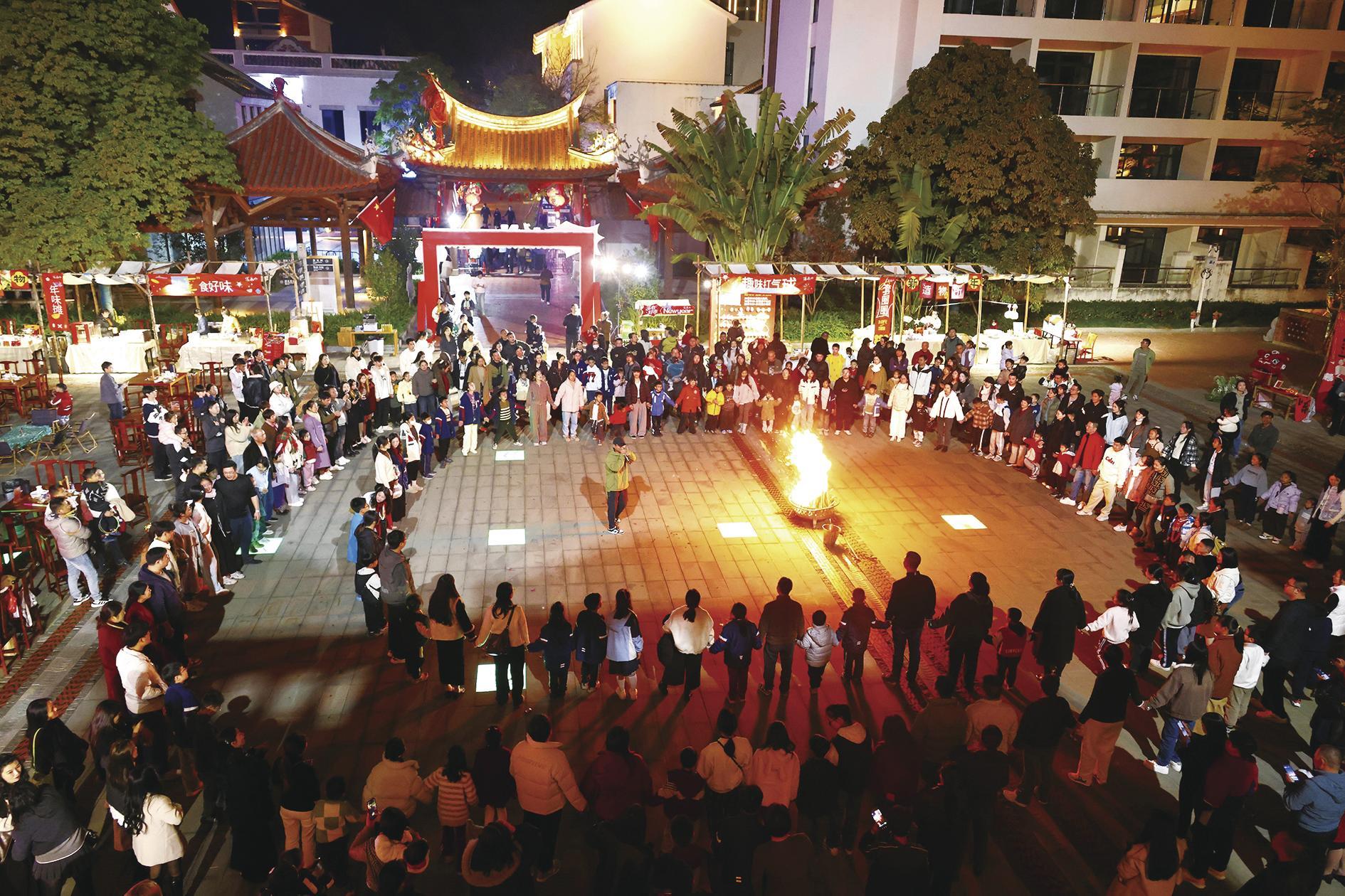 除了唱响“村乐”、登高望远、“福马”寻宝,动感的安溪还有夜幕下的溪禾山铁观音文化园——高空矩阵挑战者凌空翻转,围炉煮茶区蒸汽袅袅升腾。零点钟声敲响时,长达8分钟的烟花秀照亮夜空,10000多发烟花在茶山轮廓线上绽放出“七彩祥云”“万马奔腾”的光影图腾。“烟花秀点燃全场热情,2000多人共同欢呼的场面真是太壮观了!”溪禾山铁观音文化园运营总监席志远激动地说。