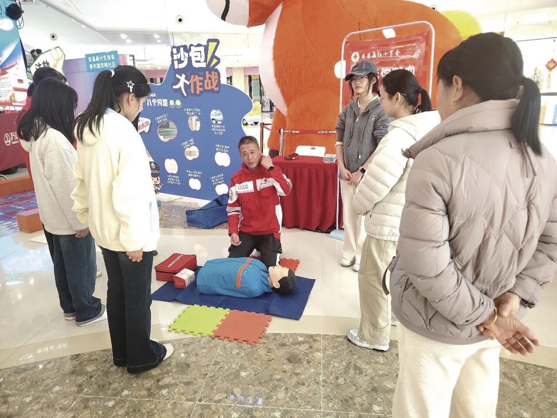 本报讯 (融媒体记者陈颖)近日,县计划生育协会、县红十字会、参内镇等单位在华阳社区联合举办“‘法’守幸福家・‘暖’聚华阳情”主题活动,来自县红十字会的救护师结合人体模型,演示心肺复苏(CPR)与海姆立克急救法的操作要点,帮助居民掌握基本救护方法,提升家庭自救互救能力。