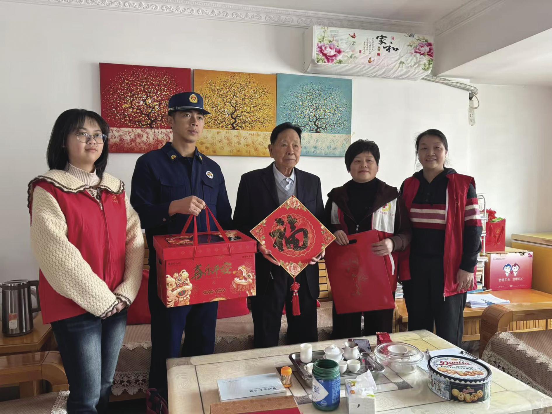 凤城镇凤山社区居委会携手共建单位志愿者向社区居民代表送上春联、大礼包和“福”字等物品