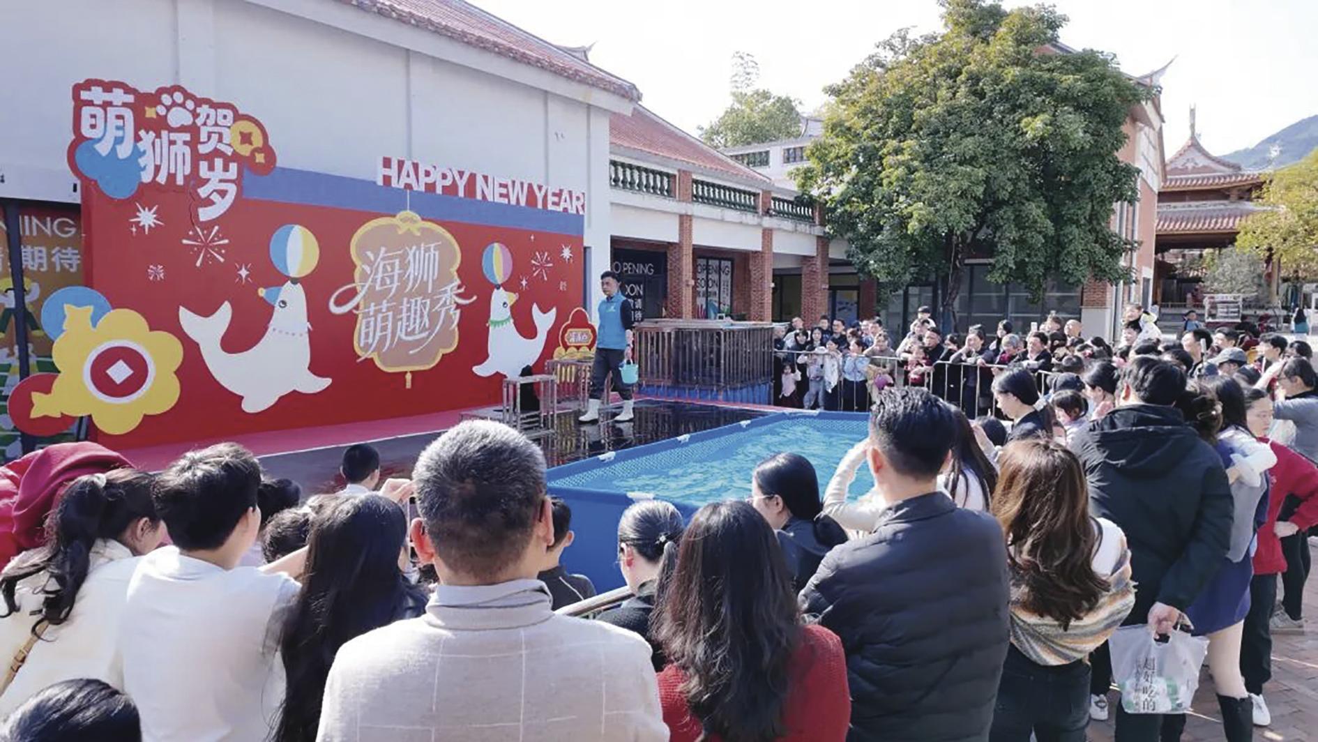 位于参内镇东二环路的溪禾山铁观音文化园,凭借优美的自然风光和丰富的休闲活动,成为市民游客新春近郊游的热门选择。迎春市集、海狮表演、高空矩阵挑战赛等活动精彩纷呈,赶鸡赶鸭、烤地瓜、宋代点茶等农趣体验更是吸引了不少亲子家庭参与。