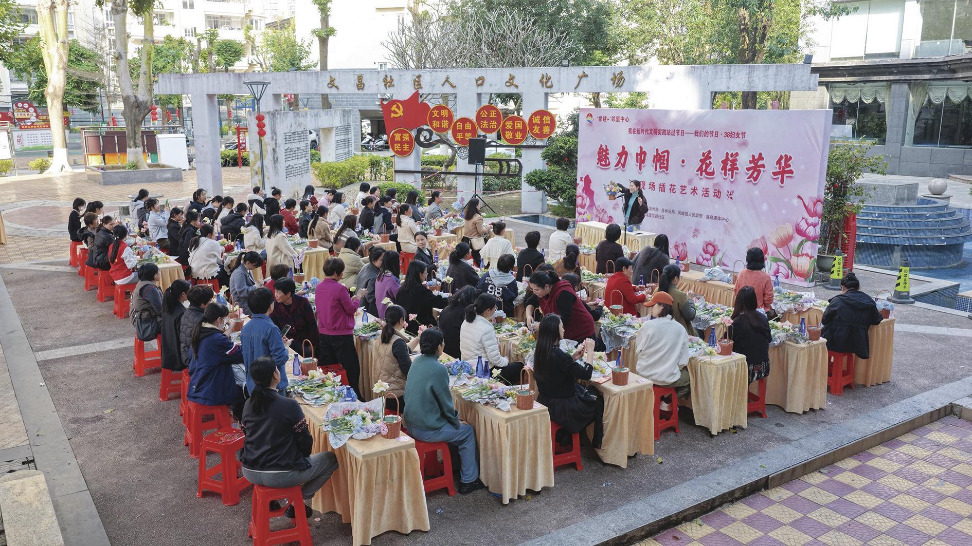 本报讯 (融媒体记者黄东华)春风有信,花开有期。近日,为庆祝第116个“三八”国际劳动妇女节,全县各级各有关部门纷纷举行各种形式的庆祝活动,提升女性的幸福感与获得感。图为5日在江滨花园小区广场举行的“魅力巾帼 花样芳华”现场插花艺术活动。