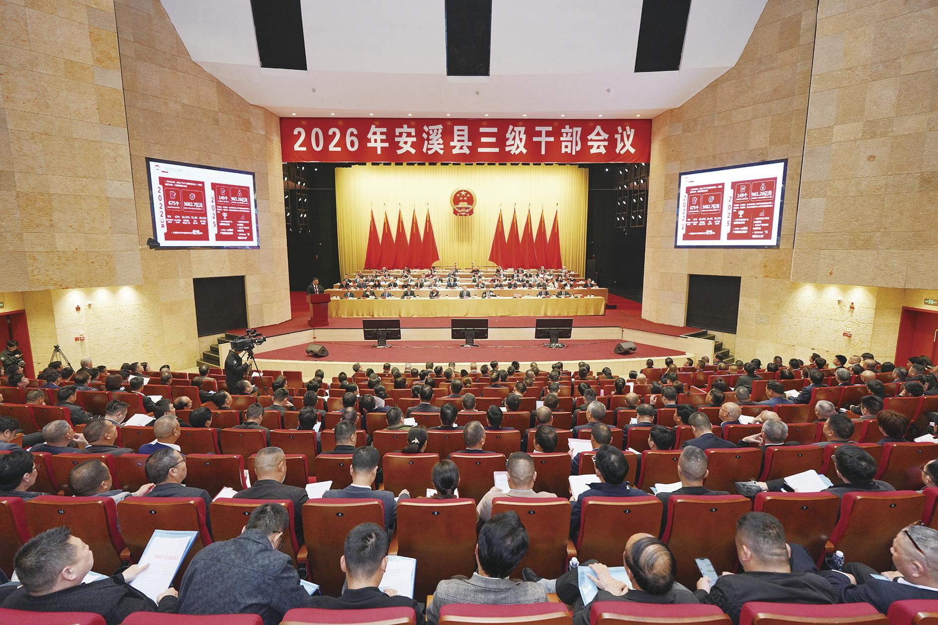 3月2日,我县召开“深学争优、敢为争先、实干争效”行动总结部署会暨2026年三级干部会议。会议传达学习了全省、全市“三争”行动总结部署会及全市相关工作会议精神,全面回顾总结2025年工作成效,并对2026年重点任务进行了系统部署。会上,县委书记吴毓舟、县长刘永强分别发表讲话,为新一年发展擘画蓝图、指明方向,发出了奋勇争先推进中国式现代化安溪实践的动员令,号召全县上下以“归零”心态再启程,以奋进姿态再拼搏,努力为全市乃至全省发展大局作出新的更大贡献!现将讲话全文刊载如下,供全县广大干部群众认真学习领会,抓好贯彻落实。